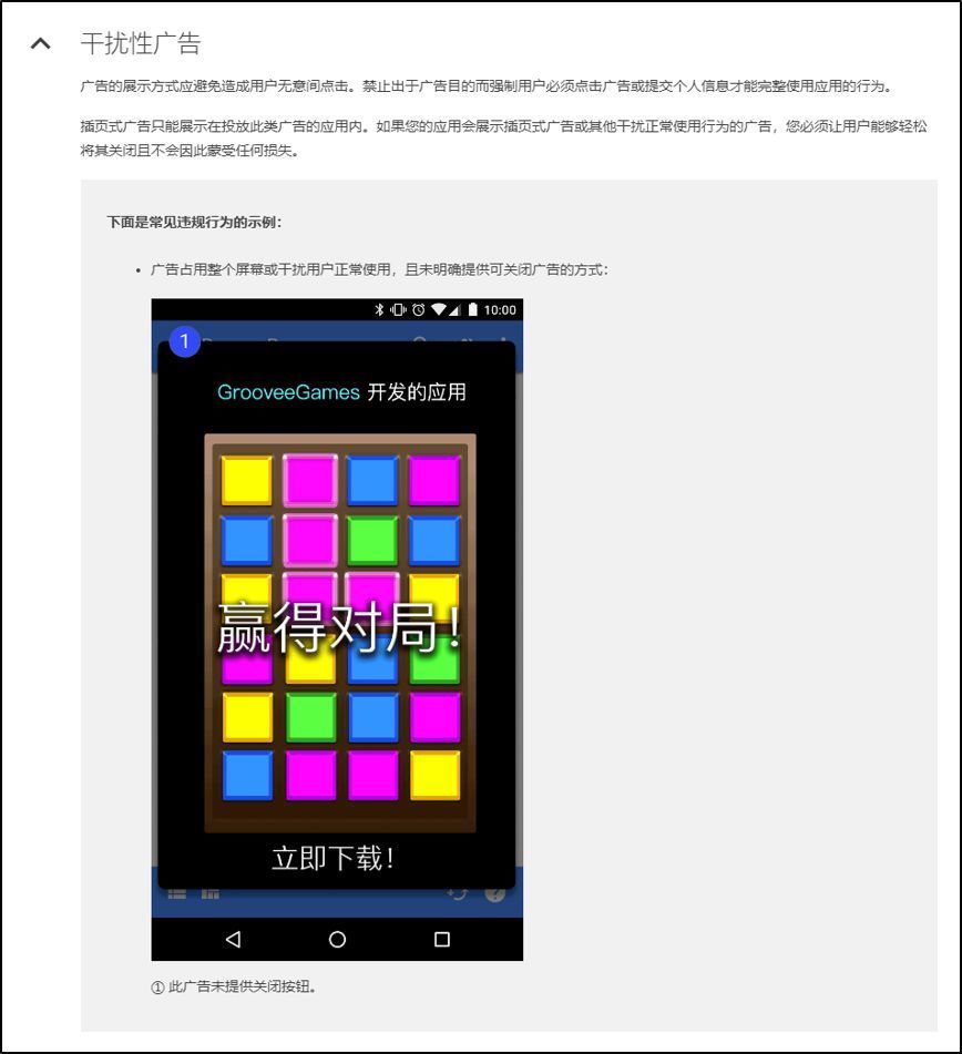 谷歌在官方博客上解釋,此次下架的原因是這批應(yīng)用違反谷歌的兩條廣告政策:分別是“干擾性(disruptive)廣告政策”和“違規(guī)插頁式(interstitial)廣告政策”。