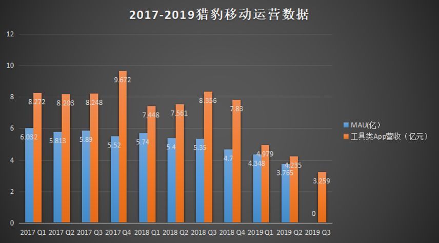 但隨著近年來移動(dòng)互聯(lián)網(wǎng)紅利見頂,獵豹移動(dòng)主打的工具類App逐漸進(jìn)入發(fā)展瓶頸期。2016年初一度突破6.5億的月活巔峰之后(如上圖所示),2017年開始獵豹移動(dòng)工具類App的營收和活躍用戶數(shù)據(jù)下滑明顯。2019年各個(gè)季度工具類App的營收相比2017年和2018年同期幾乎腰斬,月活數(shù)據(jù)也從2017年初的6億降至2019年Q2的3.8億(2019年Q3未公布月活數(shù)據(jù))。